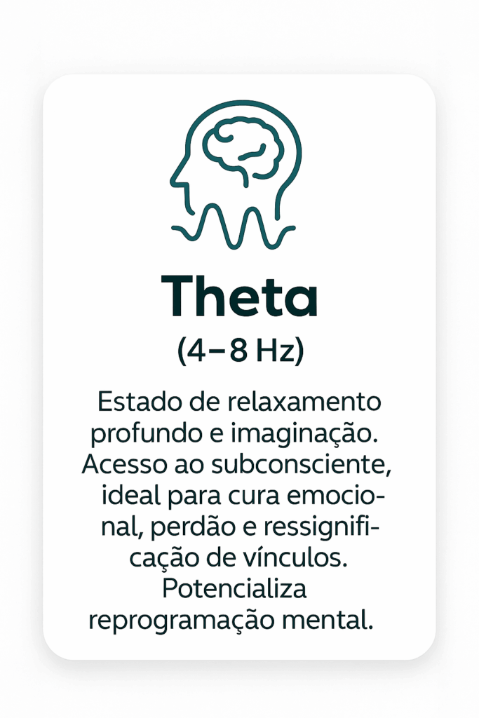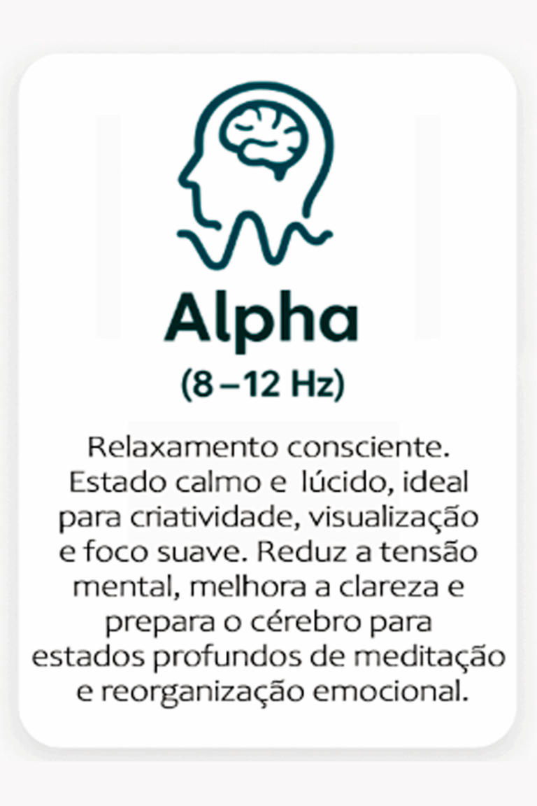 Em contrapartida, ondas mais lentas, como Alpha e Theta, colocam o cérebro em um estado seguro, receptivo e mais plástico — condição ideal para transformar padrões inconscientes, reprocessar memórias e restabelecer equilíbrio emocional.